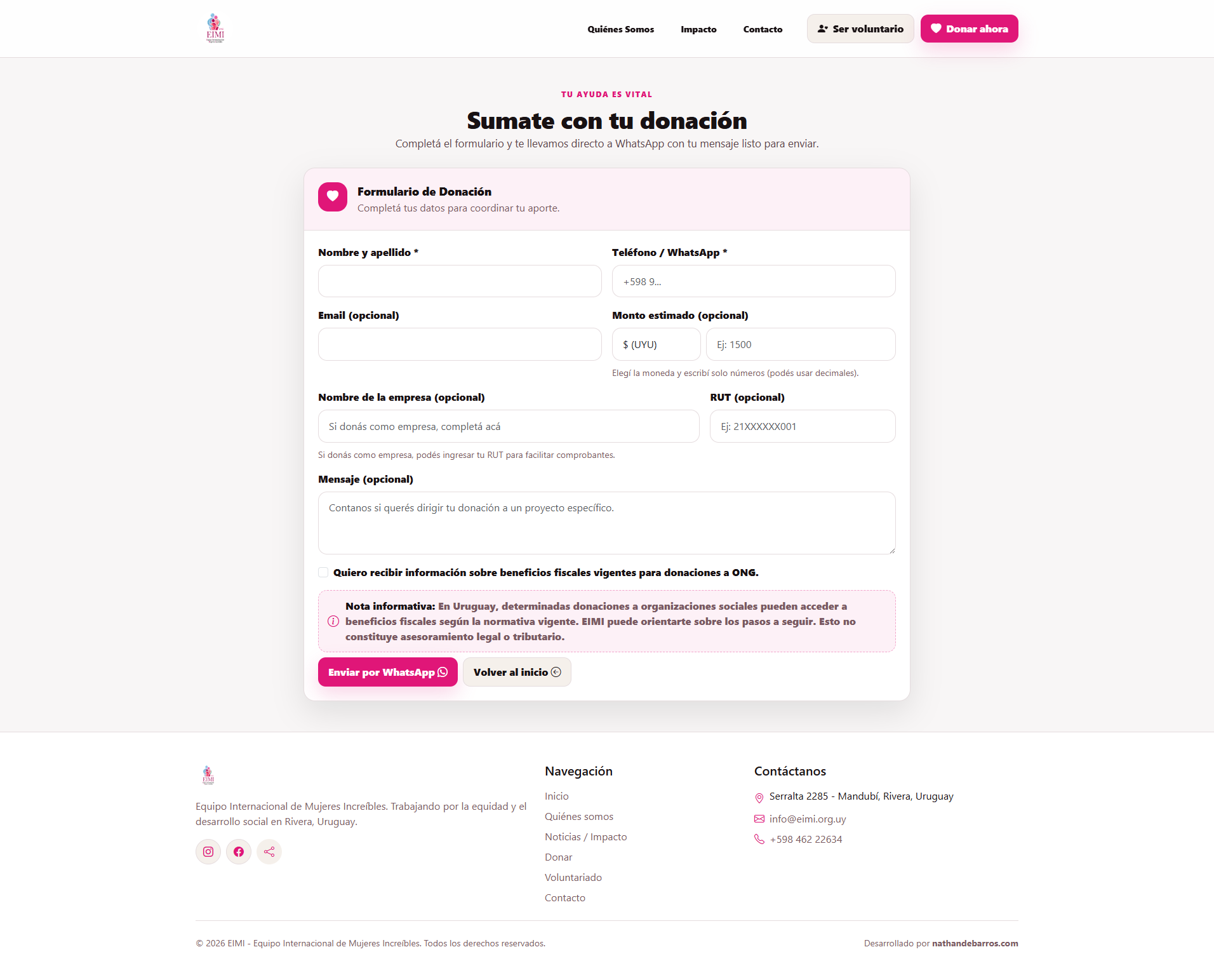 EIMI (Equipo Internacional de Mujeres Increíbles) es una ONG con más de 18 años de trayectoria en Rivera, Uruguay. El desafío fue construir una plataforma institucional moderna que combine impacto visual, claridad estructural y performance real.